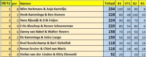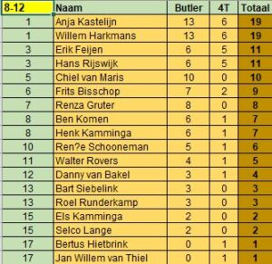 Achteraf gezien is het een 6Sa, of zelfs 7SA. Helaas hebben we de kaarten niet bij de hand, maar die kant moet het wel uit, met een 0/1/7/5 verdeling aan de ene kant, en een 6/2/2/3 verdeling aan de andere kant, en iets als 33 punten samen…. De actuele standen vind je hieronder: